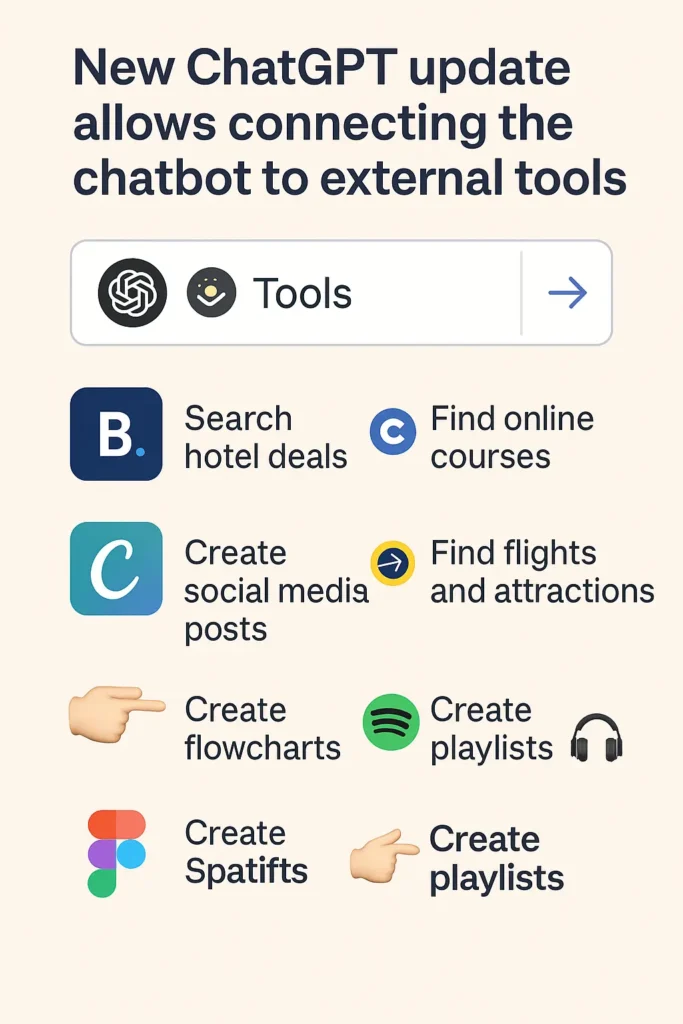 With this new update, ChatGPT can now “talk” to external apps like Spotify, Canva, Expedia, and more – all without leaving the chat window.